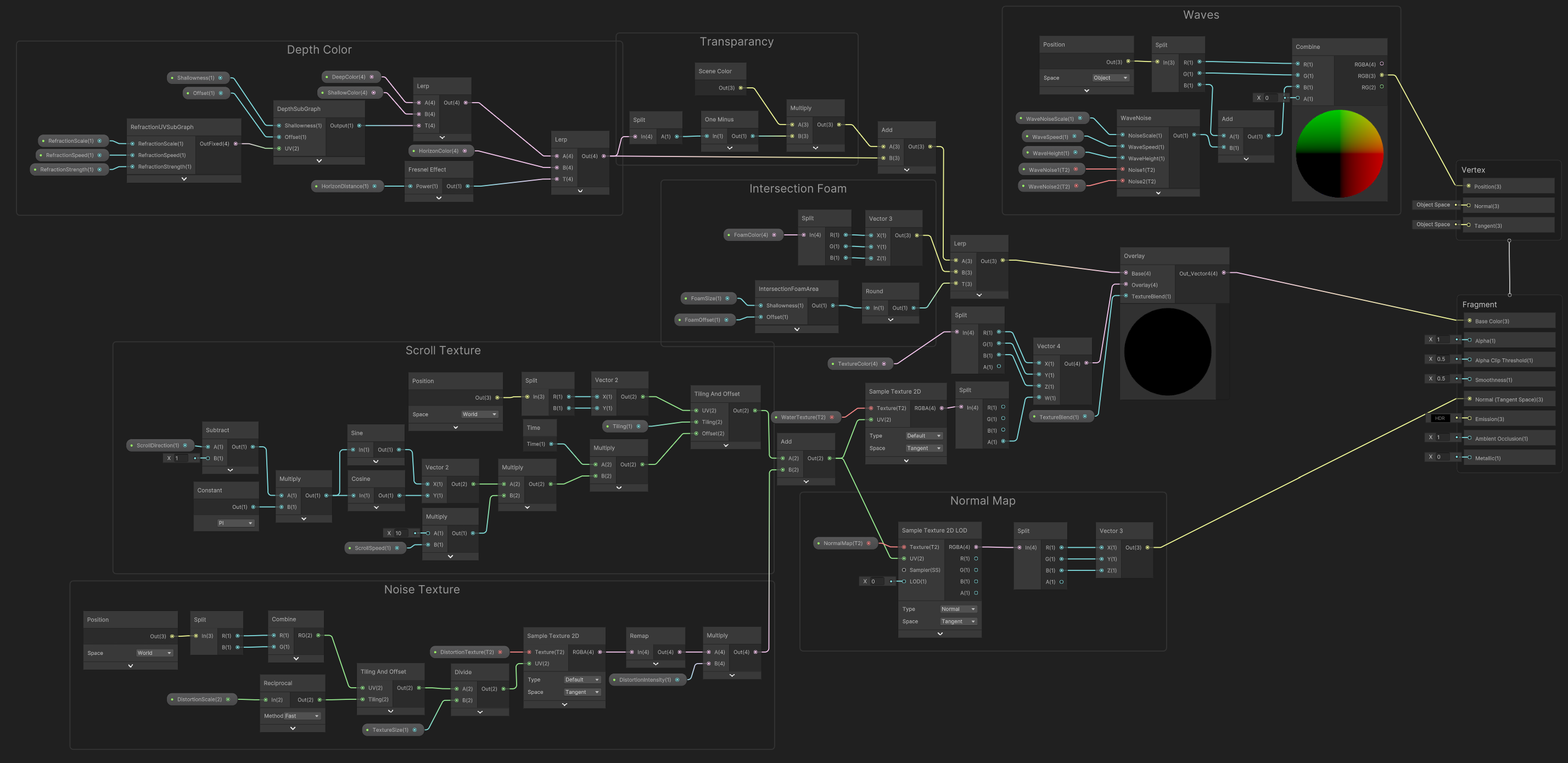 Color The shader blends between a few different colors, A deep color, shallow color, horizon color. I lerp between the shallow and deep color to get a gradient between the parts closer to the walls/shore. The horizon color is used to give water that is far away a different color to give a better sense of distance. I also use a similar calculation to create foam where objects intersect the water.